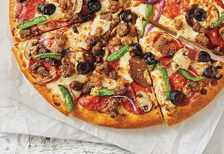 Pepperoni, Ham, Onion, Green Pepper, Mushroom, Red Sauce and Our Mozzarella Cheese Blend